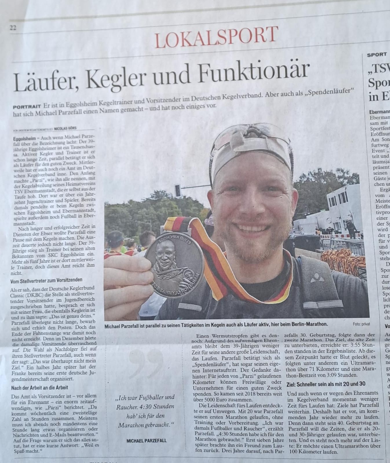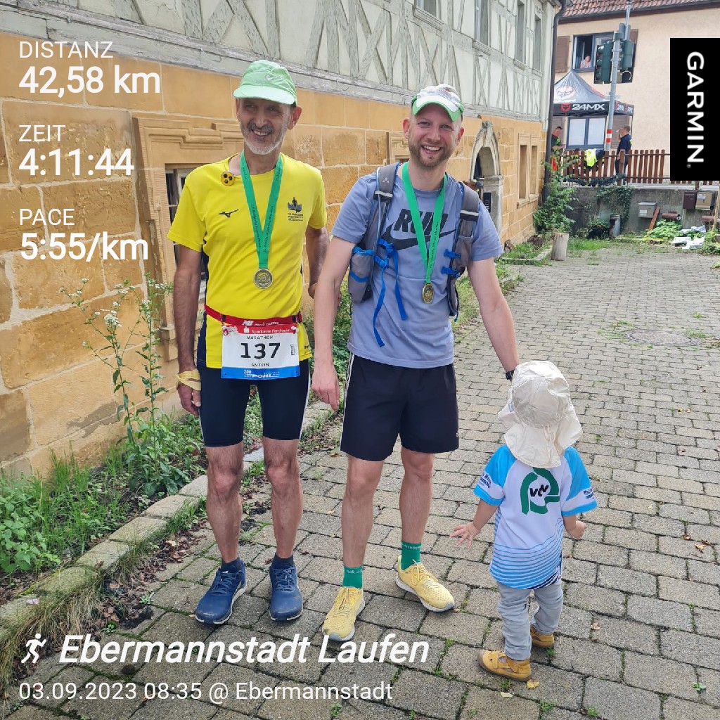 Kurz vor dem Ziel standen Freunde und meine Familie. Meine Tochter Juliane kam auf die Straße. Eigentlich wollte sie mit mir über die Ziellinie laufen, aber bei der lauten Musik und den vielen Leuten wurde es ihr zu heikel. Nach ein paar Meter tragen, hob ich sie auf meine Schultern und trug sie so über die Ziellinie. Danach war aber relativ schnell Schluss. Bei mir körperlich, bei ihr emotional. Wir blieben dann in Entfernung zum Zielbereich weiter vorne auf Höhe meines Elternhauses. Dort erzählte ich über den Lauf, ließ mir gratulieren und sammelte mich kurz.