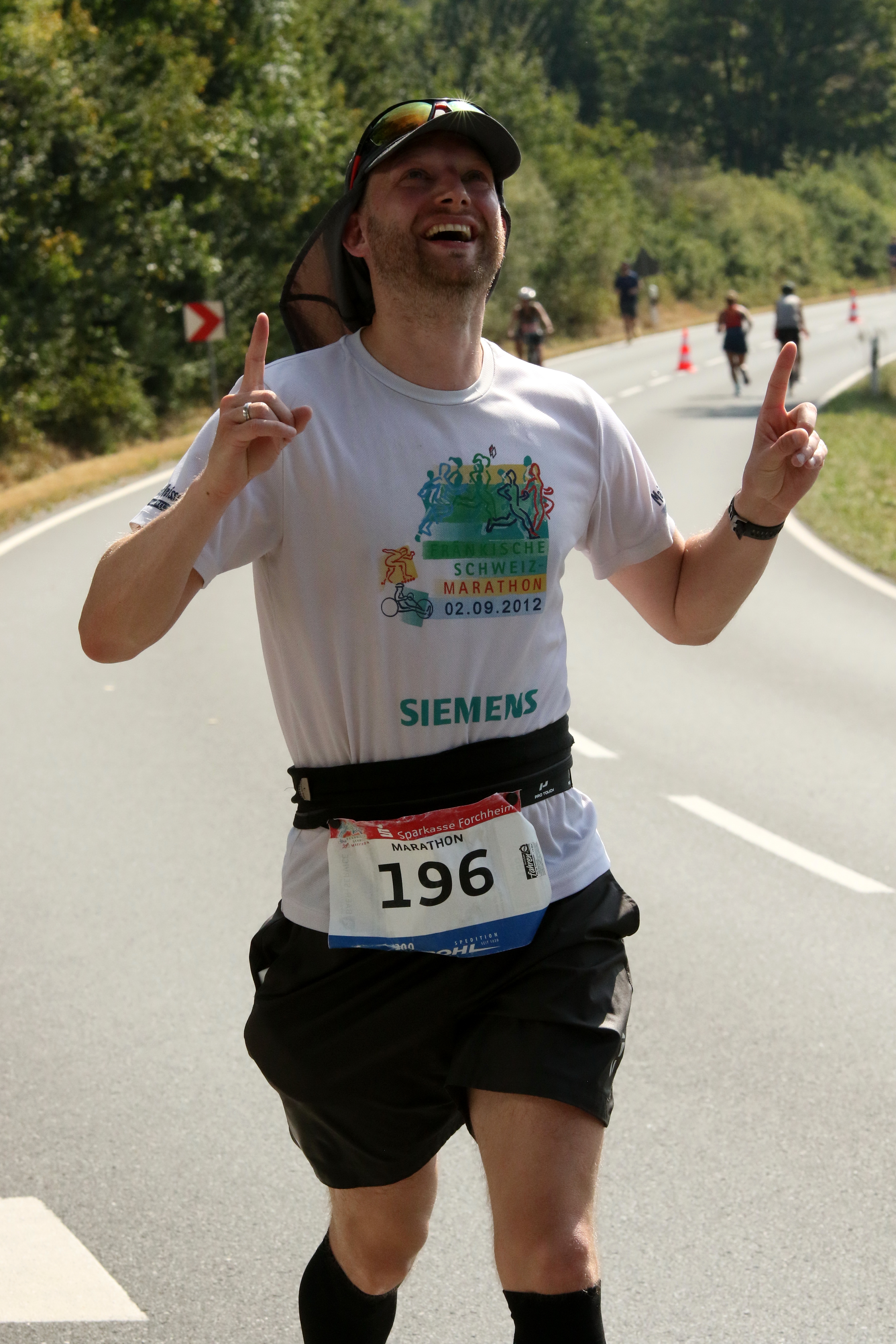 Zum einen besorgte ich mir noch etwas Verpflegung und auch eine Mütze mit Nackenschutz, zum anderen ging ich es mental an, als ob ich einmal durch die Hölle laufen würde. Um 8:35 Uhr fiel in Ebermannstadt dann der Startschuss. Warum laufe ich hier? Ach ja, aus Tradition. Am Ende sollte es mein 6. FSM über die ganze Distanz werden – nur noch vier bis zum neu gegründeten Jubilee-Club!